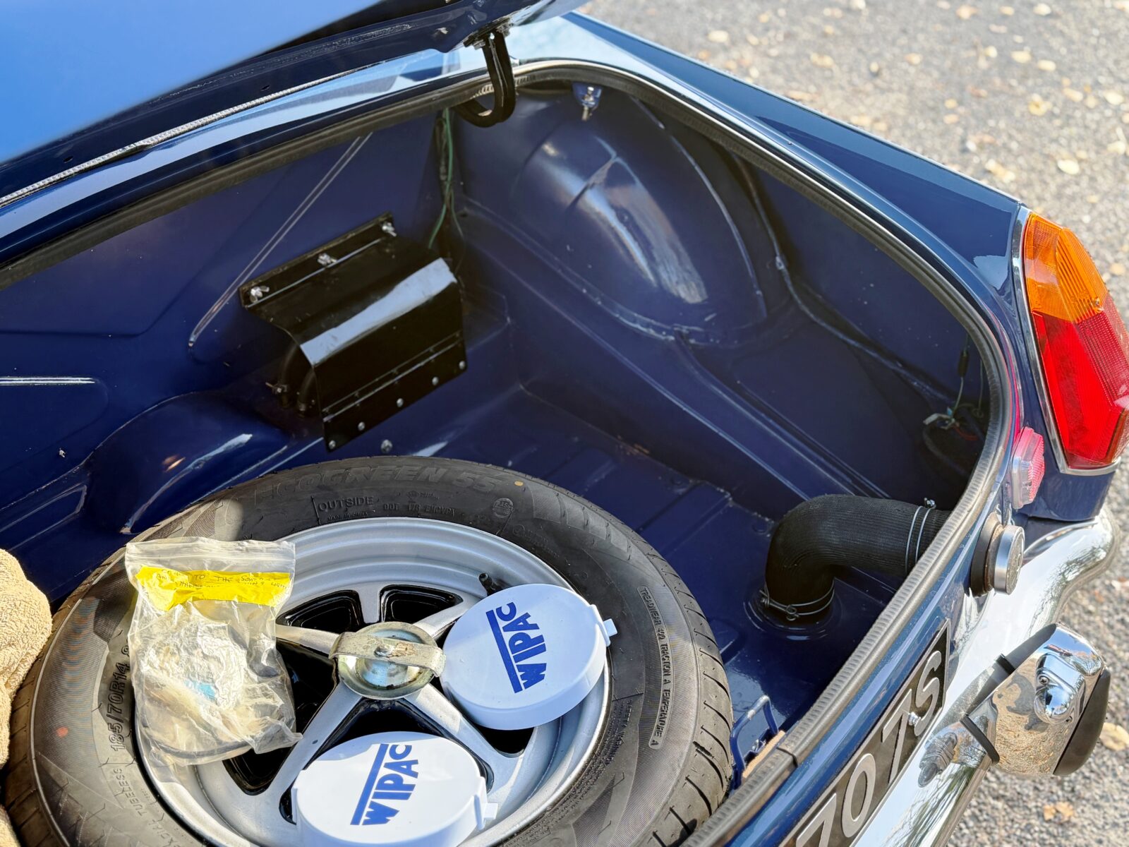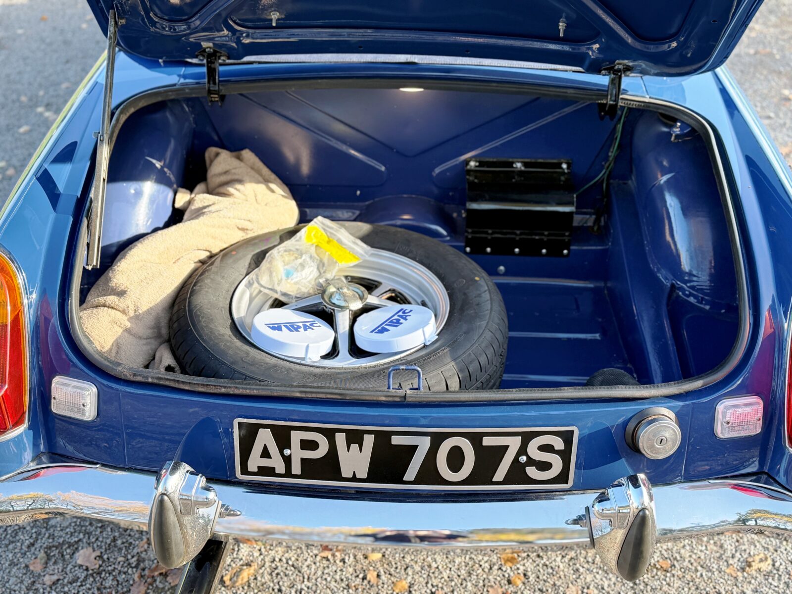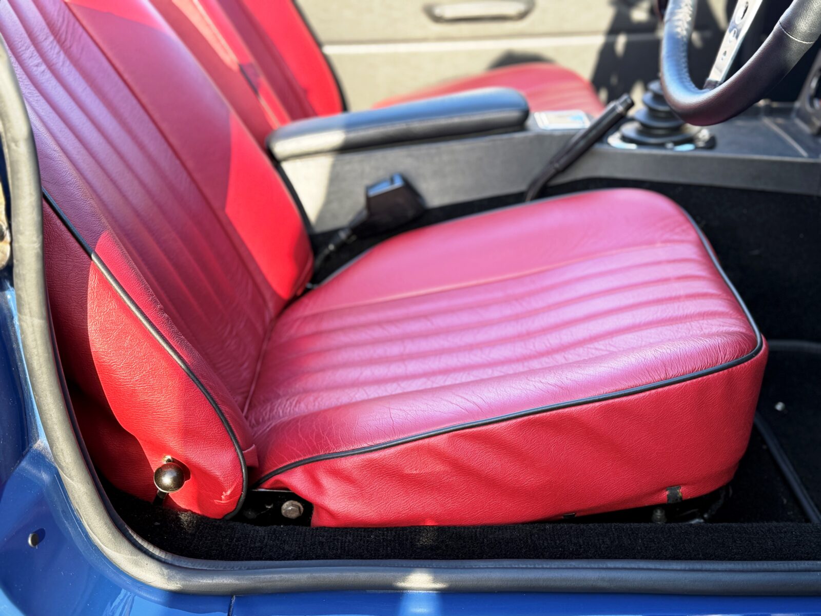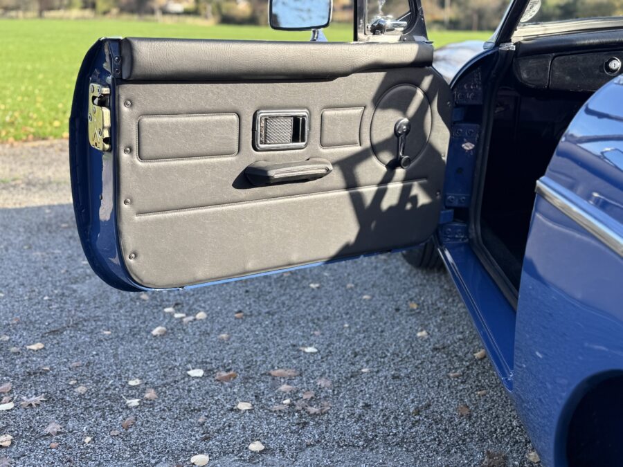 Originally a rubber bumper car finished in Russet Brown, repainted in Mineral Blue along with the chrome bumper conversion at the time of restoration 2022 – 2024