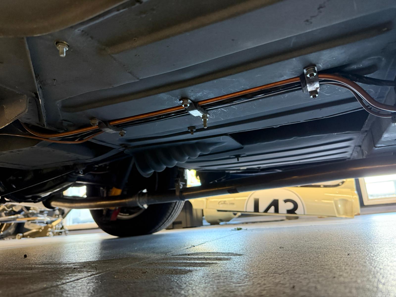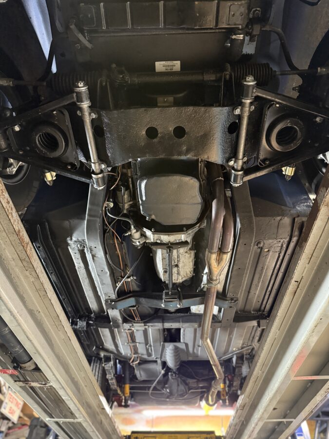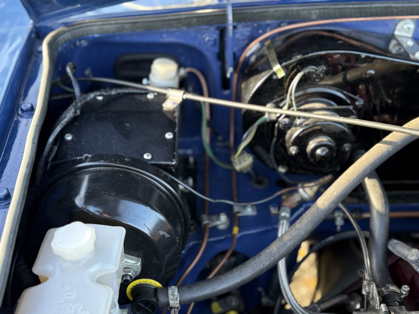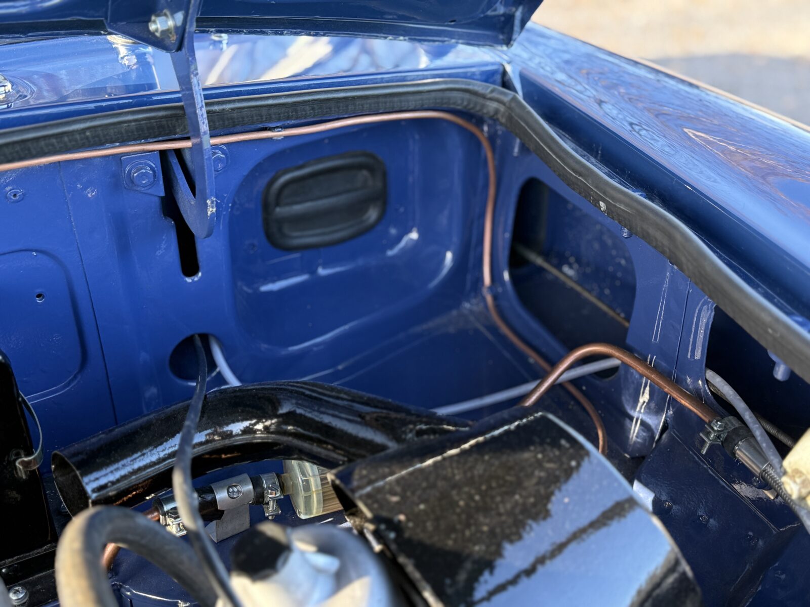 Originally a rubber bumper car finished in Russet Brown, repainted in Mineral Blue along with the chrome bumper conversion at the time of restoration 2022 – 2024